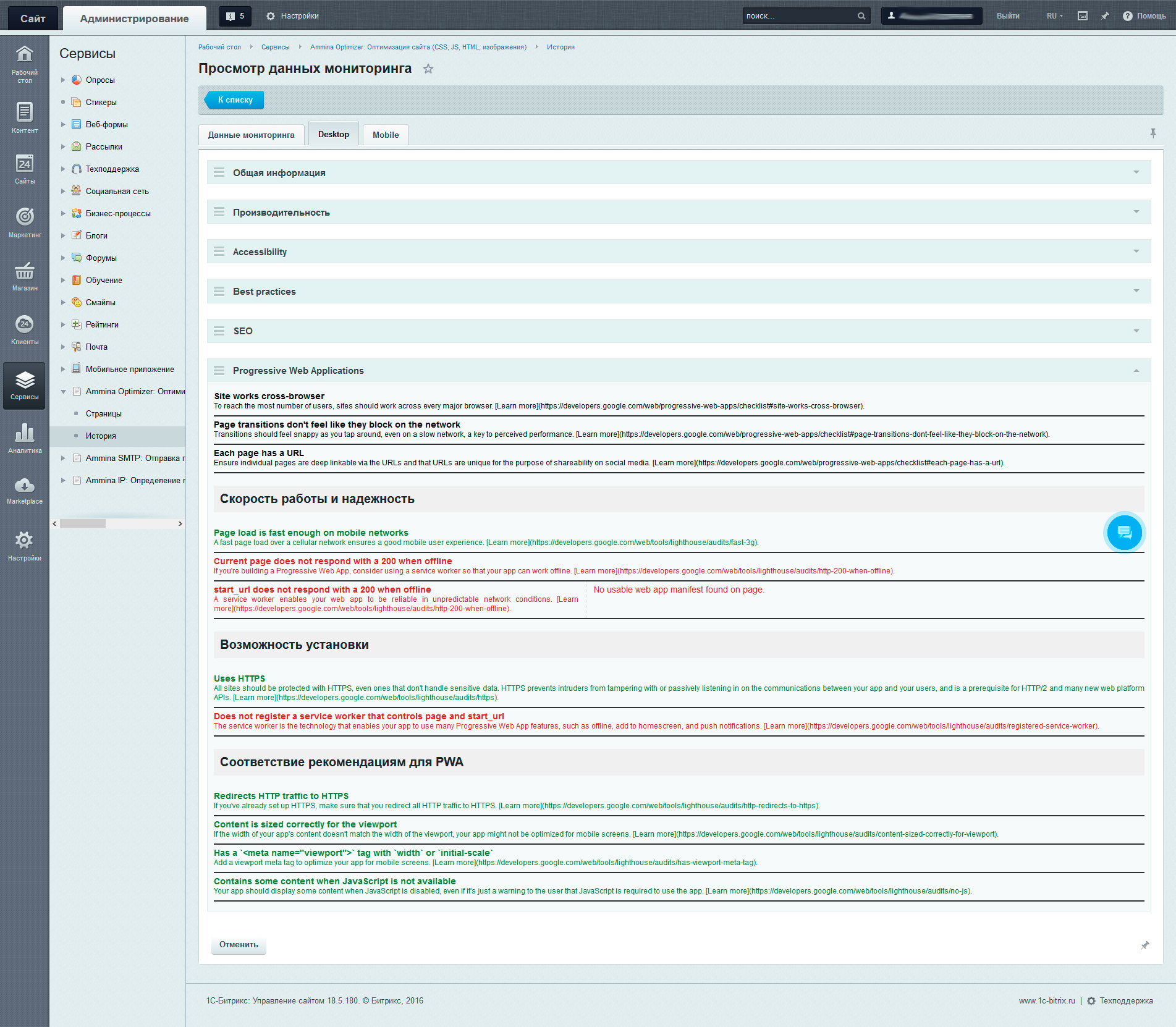 В разделе отображается информация о проведенном аудите PWA. Для улучшения качества сайта, рекомендуется исправить пункты, помеченные красным и оранжевым цветом.