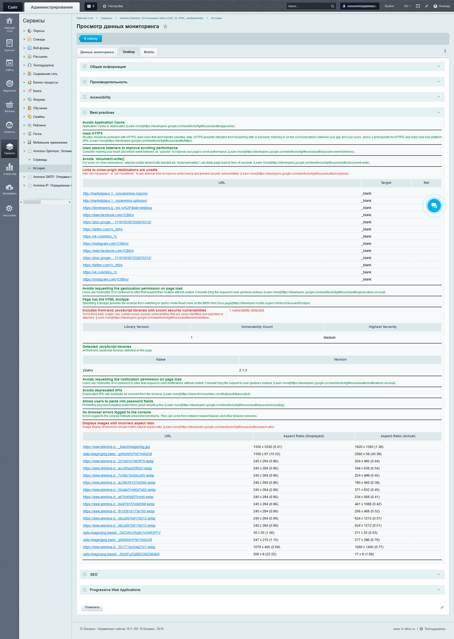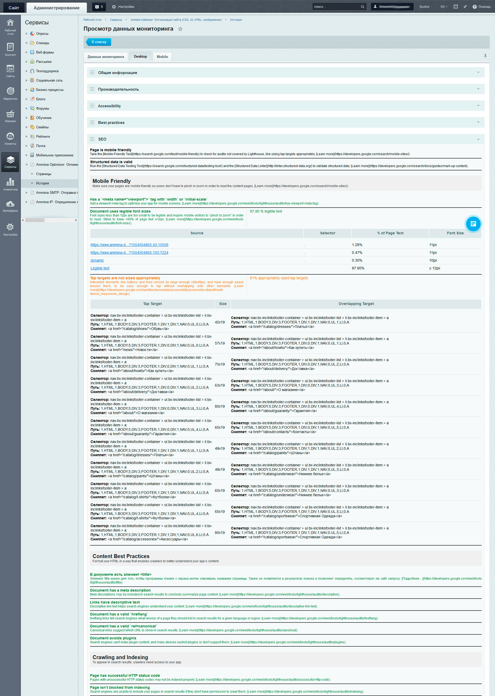 В разделе отображается информация о проведенном аудите SEO. Для улучшения качества сайта для поисковых систем и улучшения результатов индексирования, рекомендуется исправить пункты, помеченные красным и оранжевым цветом.